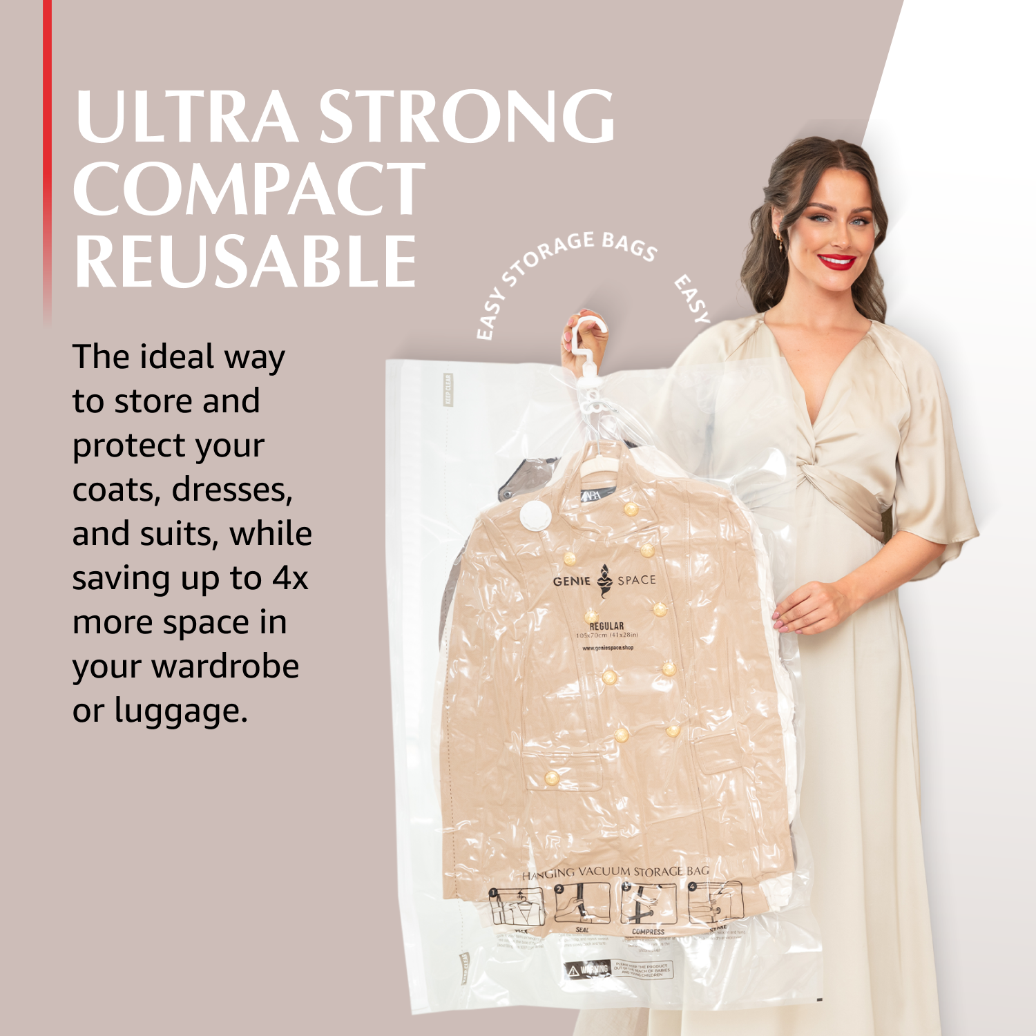 Our popular REGULAR Hanging Vacuum Bags are ideal for storing a range of hanging clothing items such as suits, shirts, and shorter dresses to maximise wardrobe space – creating up to 80% more space!