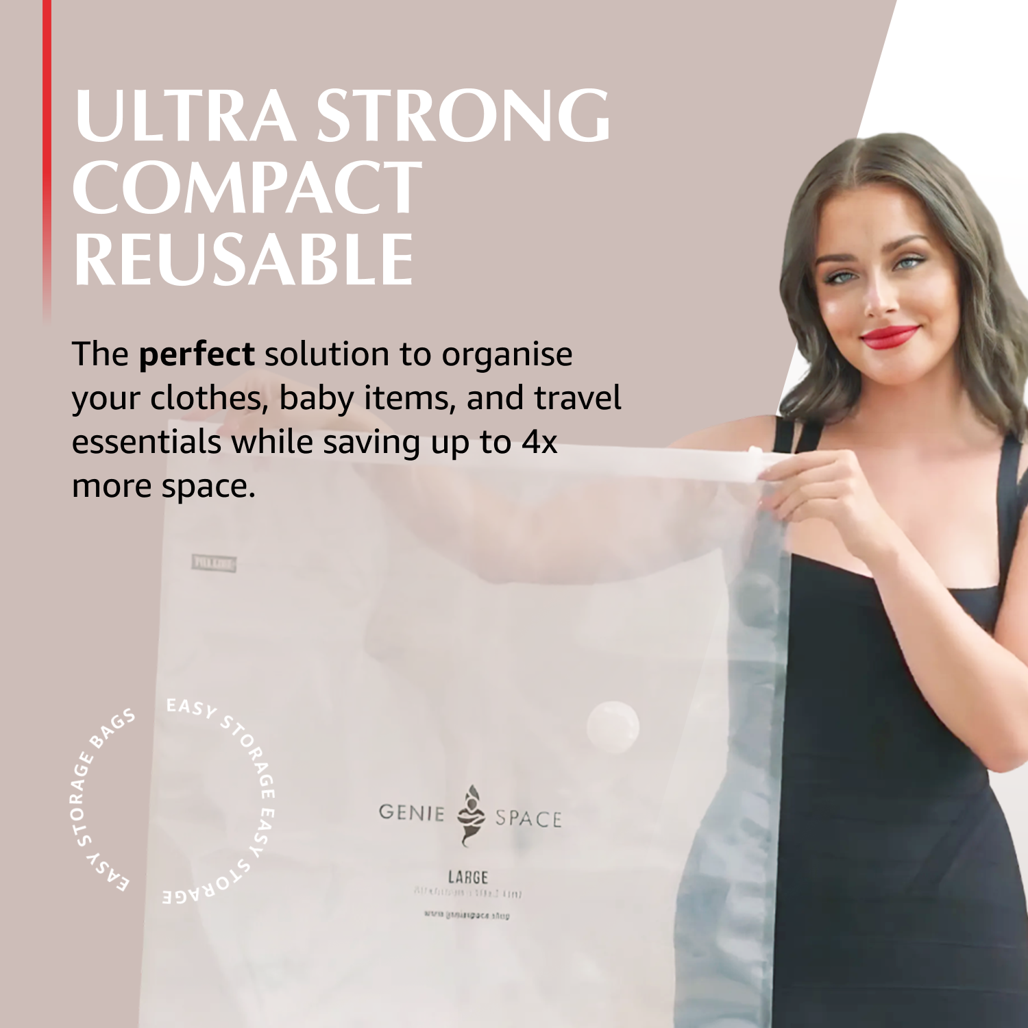 Our LARGE Premium Vacuum Bags are popular for saving space around the home or while travelling – ideal for storing clothes such as jackets, jumpers, jeans, and soft toys. These bags are the perfect size slipping into a drawer, wardrobe, or even car boot.